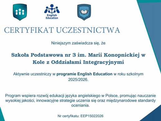 Szkoła Podstawowa nr 3 im. Marii Konopnickiej w Kole z Oddziałami Integracyjnymi przystąpiła do programu English Education for Schools, wzmacniając swoją ofertę nowoczesnej edukacji językowej.
