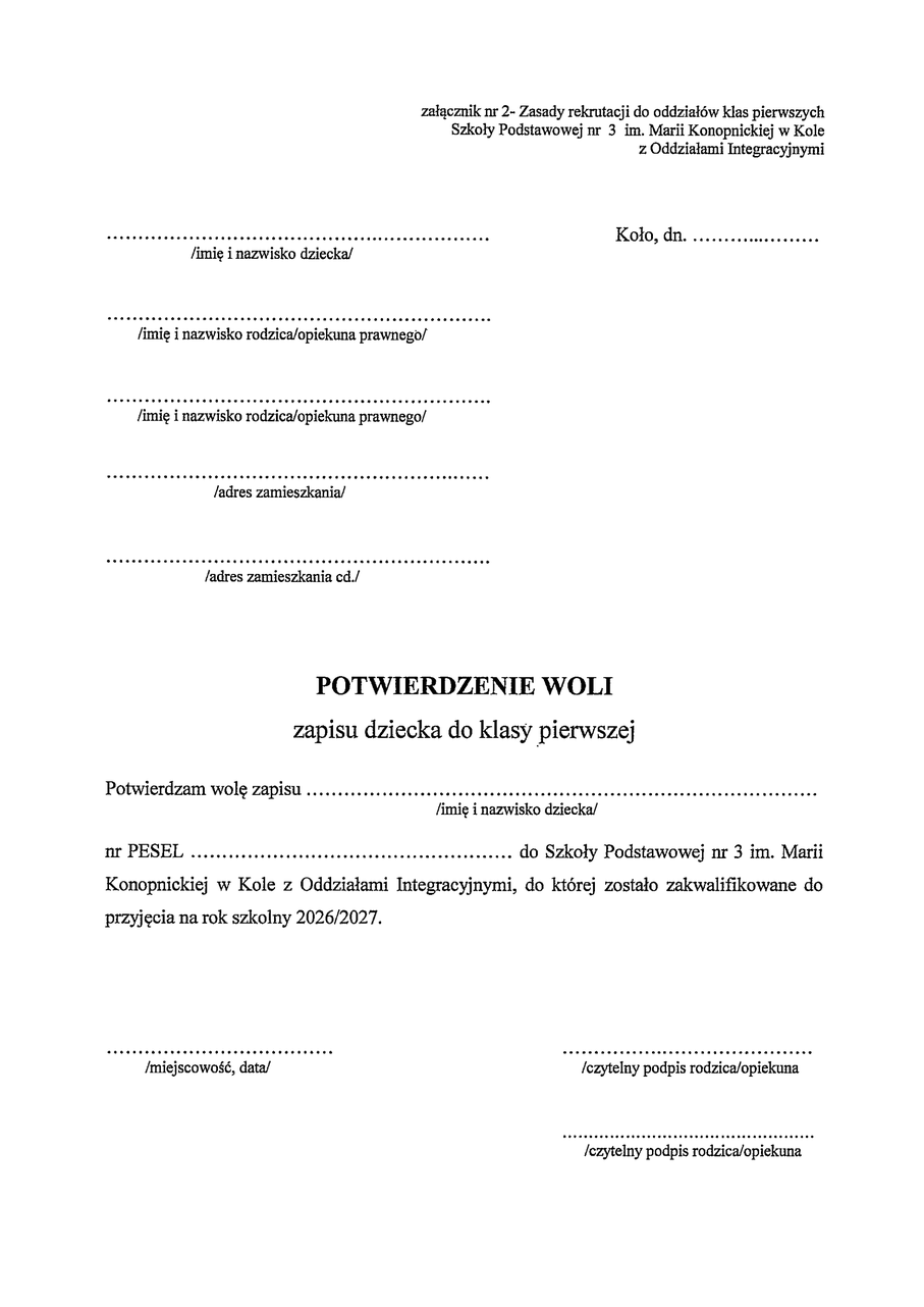 Pobierz - Potwierdzenie woli zapisu dziecka do klasy pierwszej